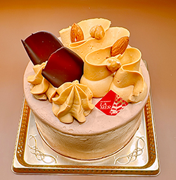 チョコレートスポンジにクルミのキャラメリゼと生チョコクリームをサンドし、キャラメルクリームでアクセントをつけました。