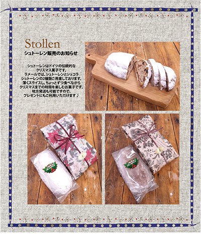 ラメールでは、シュトーレンとショコラシュトーレンの2種類ご用意しております。